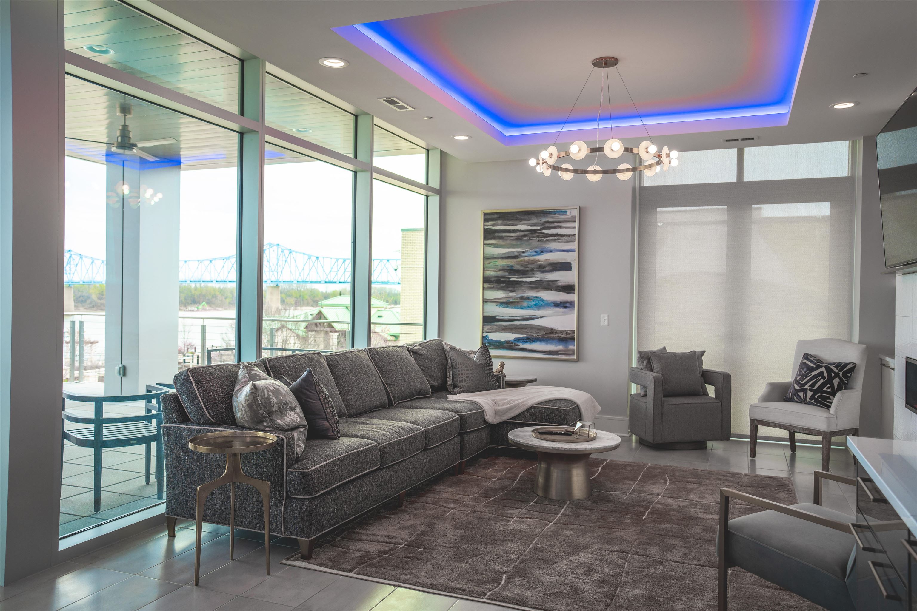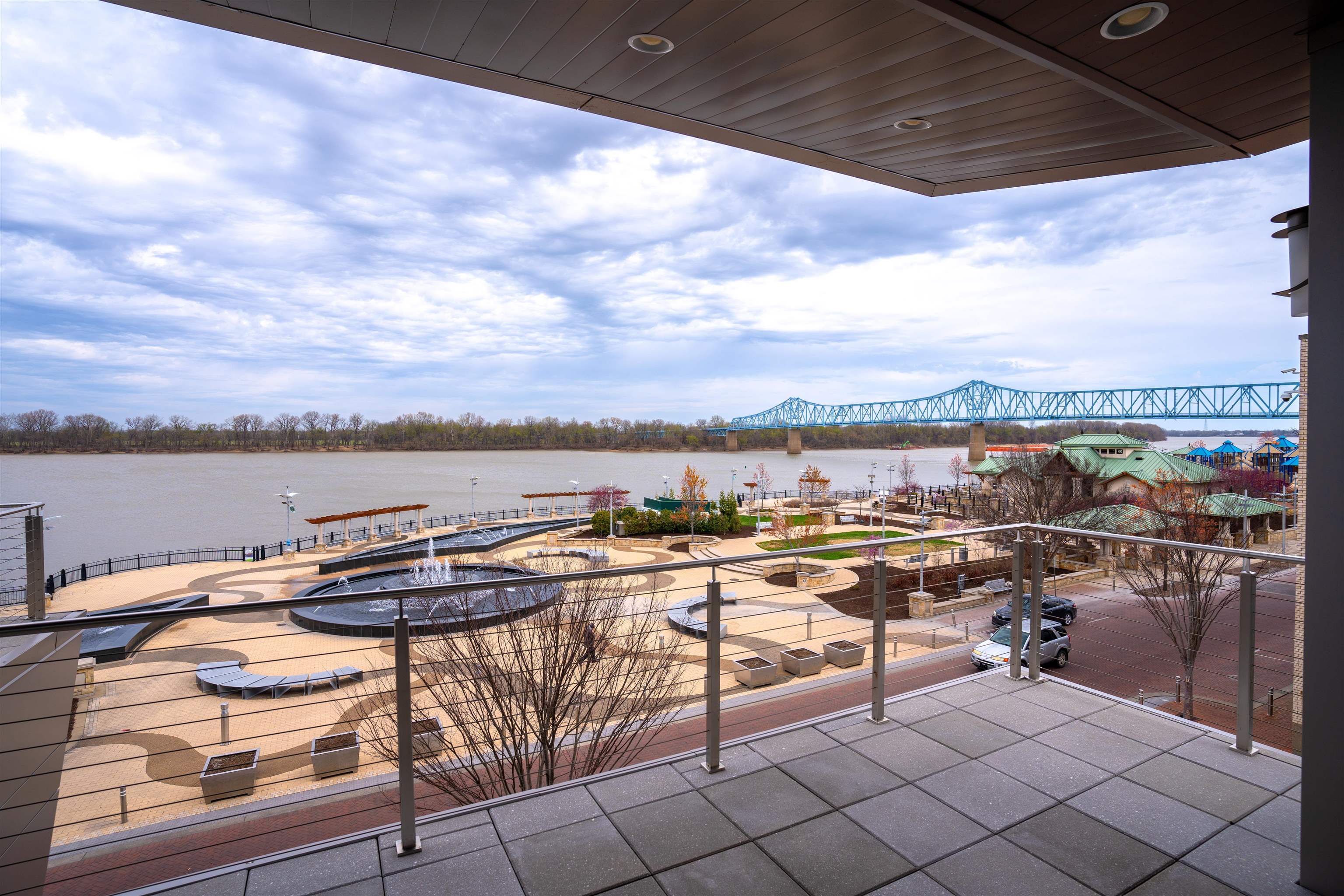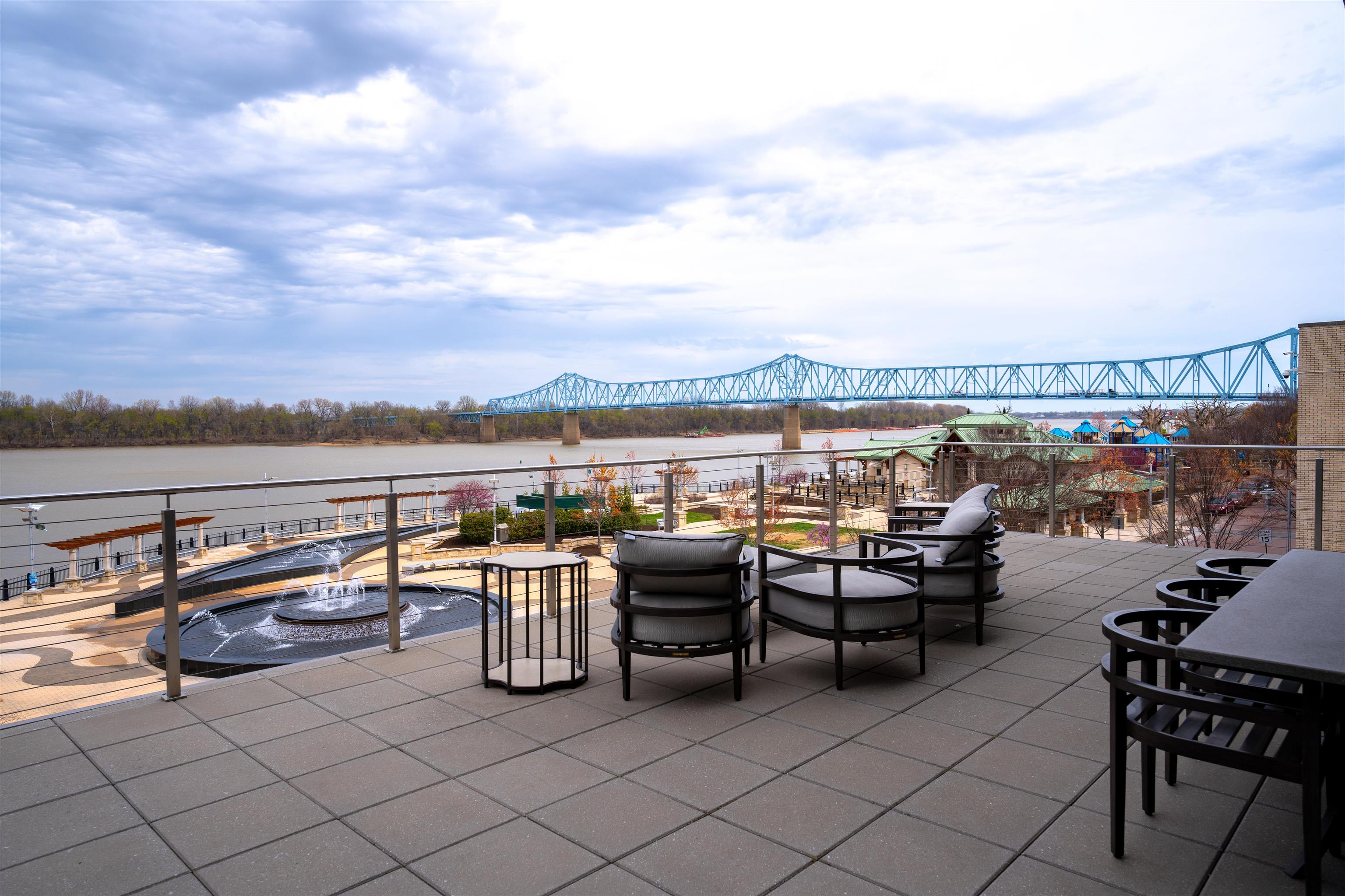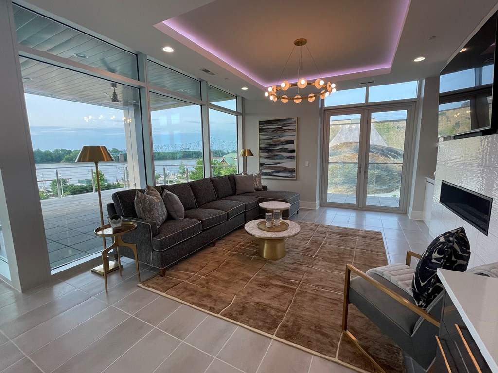 Outstanding Location with Incredible Views! This 2nd floor luxury condo is located at the showcase 'Enclave Riverfront Living' building in downtown Owensboro, KY. The two private outdoor patios are ideal for entertaining and boast panoramic views of the Ohio River, Smother's Park, Owensboro Convention Center and other downtown attractions. The large floor plan includes three bedrooms, three and a half bathrooms, a large open concept kitchen, modern fireplace, luxury finishes, outdoor grille station and top notch amenities. Floor to ceiling windows provide outstanding views and plenty of natural light. The ground floor garage is included with space for one car. The building includes private secure access for residents, food and dining options and is walking distance to all of downtown Owensboro's attractions. This residence is the pinnacle of downtown luxury living! All appliances on site, cabinets, counter tops, flooring, carpet, light fixtures, plumbing fixtures. Does not include the outdoor kitchen appliances and cabinets. Indoor Living 3,045 sq ft, Patio space 1,485 sq ft. One garage Furnished as is available: additional $65,250.00