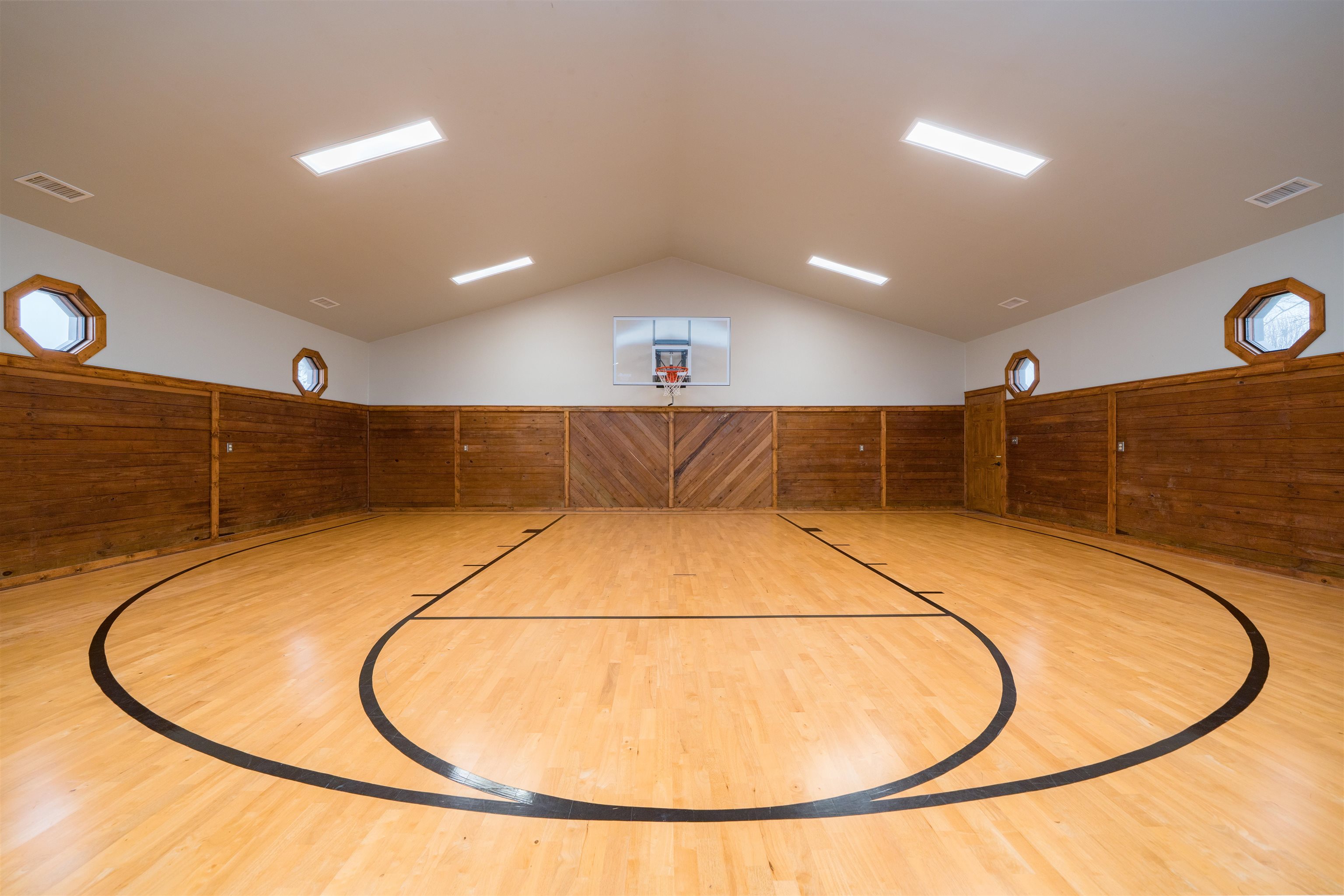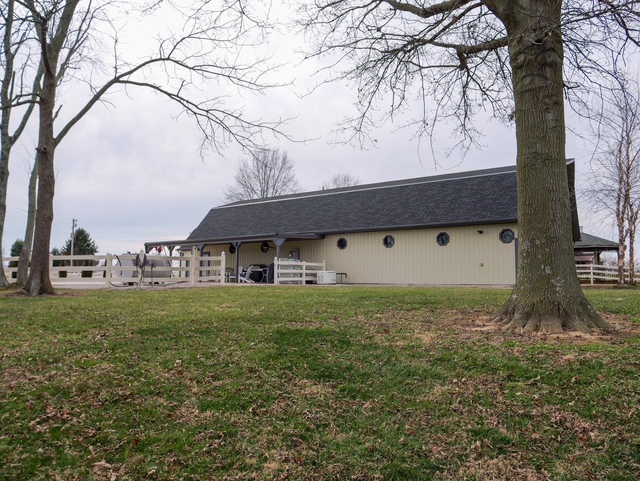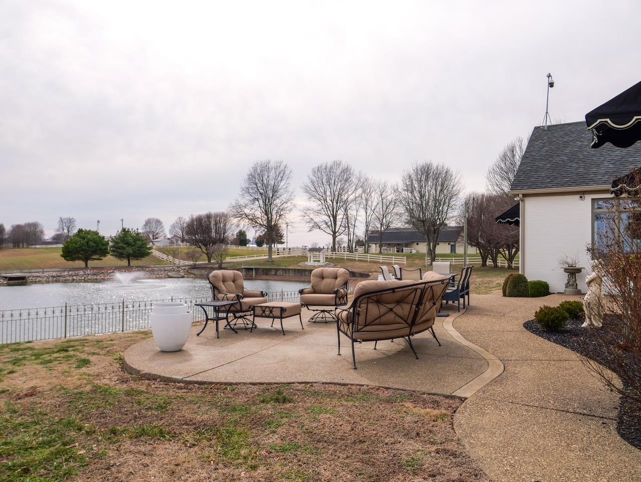 A true private luxury retreat set on nearly 8 fully fenced acres, this custom built estate delivers scale, craftsmanship, and resort level amenities rarely found in one property. With over 4,000 square feet in the main residence and more than 3,000 square feet of finished ancillary living space, this is not simply a home. It is a destination. The main residence was thoughtfully designed with an open, flowing floor plan that feels grand yet inviting. Multiple expansive living spaces and generous dining areas create effortless flow for entertaining, while two fireplaces anchor the home with warmth and architectural presence. A stunning sun room captures panoramic views of the lake and fountain, offering a peaceful setting that feels like a private resort. The finished basement adds even more versatility for recreation, media space, or extended living. Every window frames the beauty of the property. Water views, rolling acreage, and open skies become part of your everyday experience. The ancillary building elevates this estate into a category of its own. Spanning over 3,000 square feet of finished living space, it includes nearly 1,800 square feet dedicated to a full scale indoor basketball and pickleball court. Beyond the court, you will find a private wellness retreat featuring a jacuzzi and full bath with steam shower, two spacious living rooms, and an additional second floor half bath and wet bar. Whether hosting unforgettable gatherings, creating a private training facility, or accommodating guests in style, this space delivers unmatched flexibility and impact. The nearly 8 fenced acres offer ideal conditions for horses, hobby farming, or simply enjoying wide open privacy. A picturesque lake with fountain serves as the centerpiece of the grounds, providing breathtaking views and a tranquil backdrop year round. An additional workshop adds function for projects, storage, or equipment. Infrastructure meets luxury with whole home generators servicing both buildings, natural gas, new geothermal systems, new roofing, and a 500 gallon fuel tank, offering efficiency, security, and peace of mind. This is a rare opportunity to own an estate that combines custom design, recreational excellence, and resort style living, all wrapped in privacy and panoramic waterfront views.