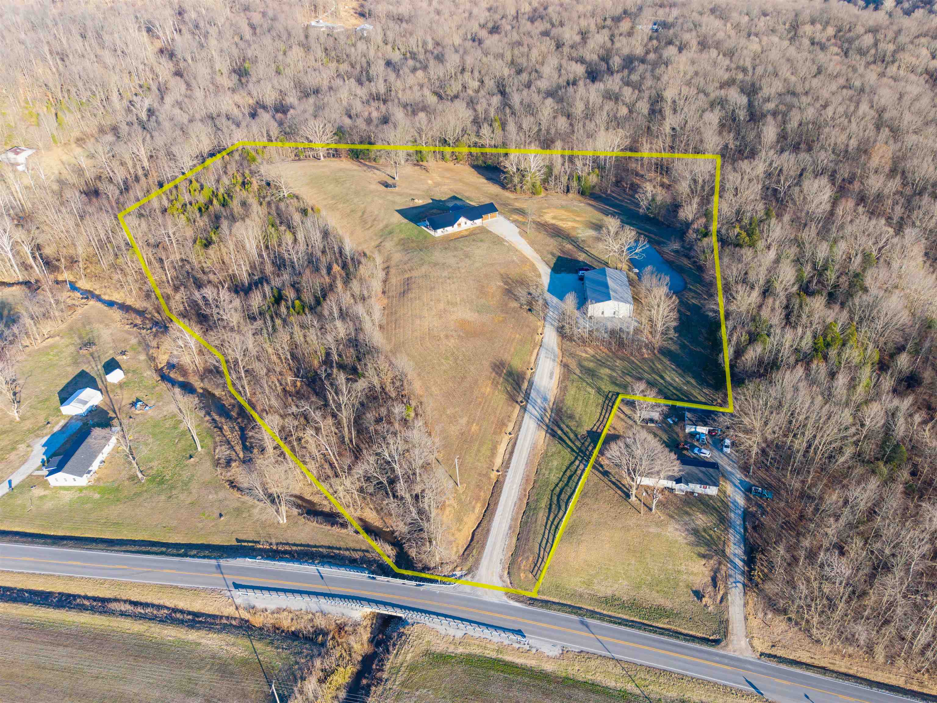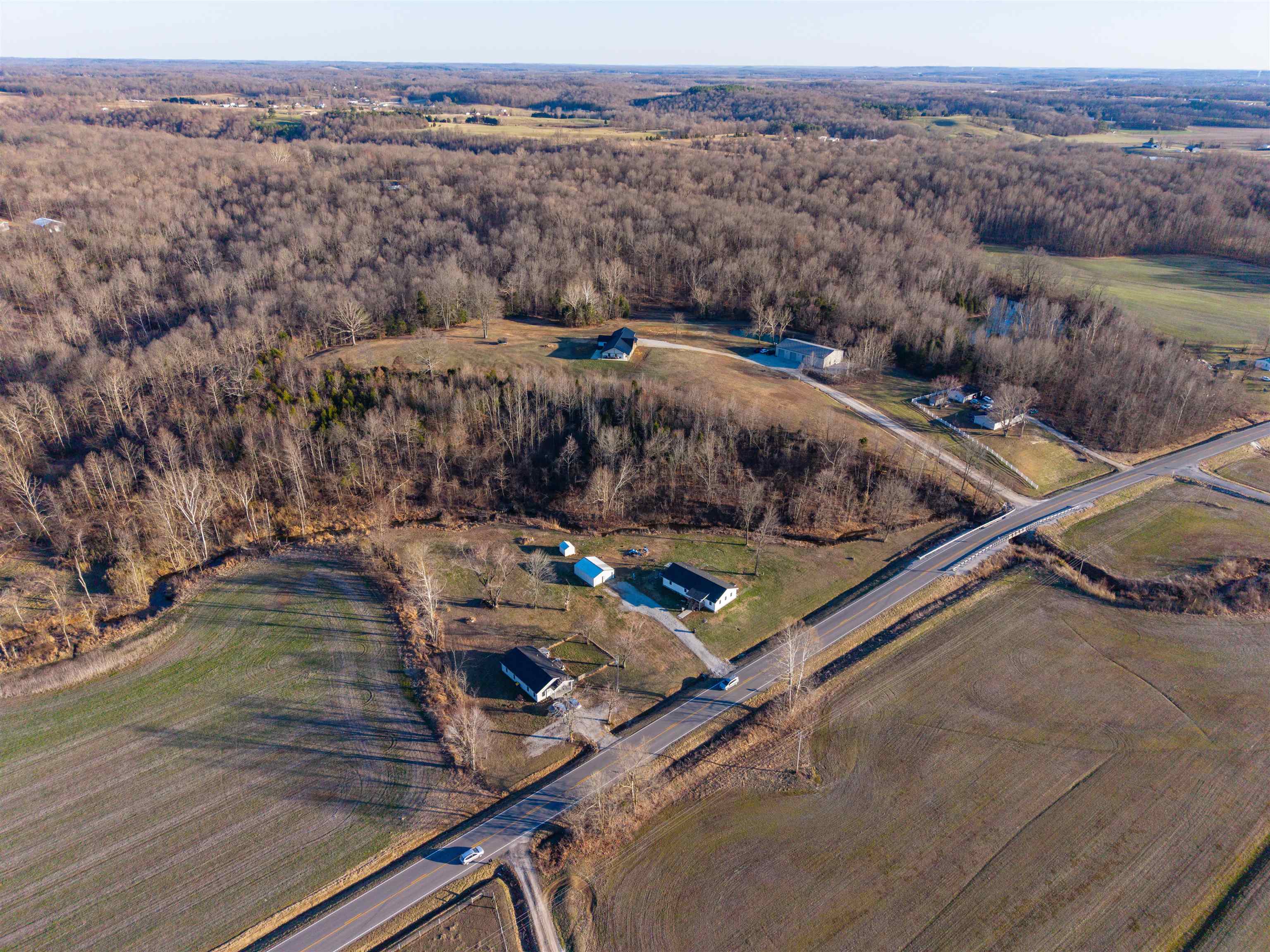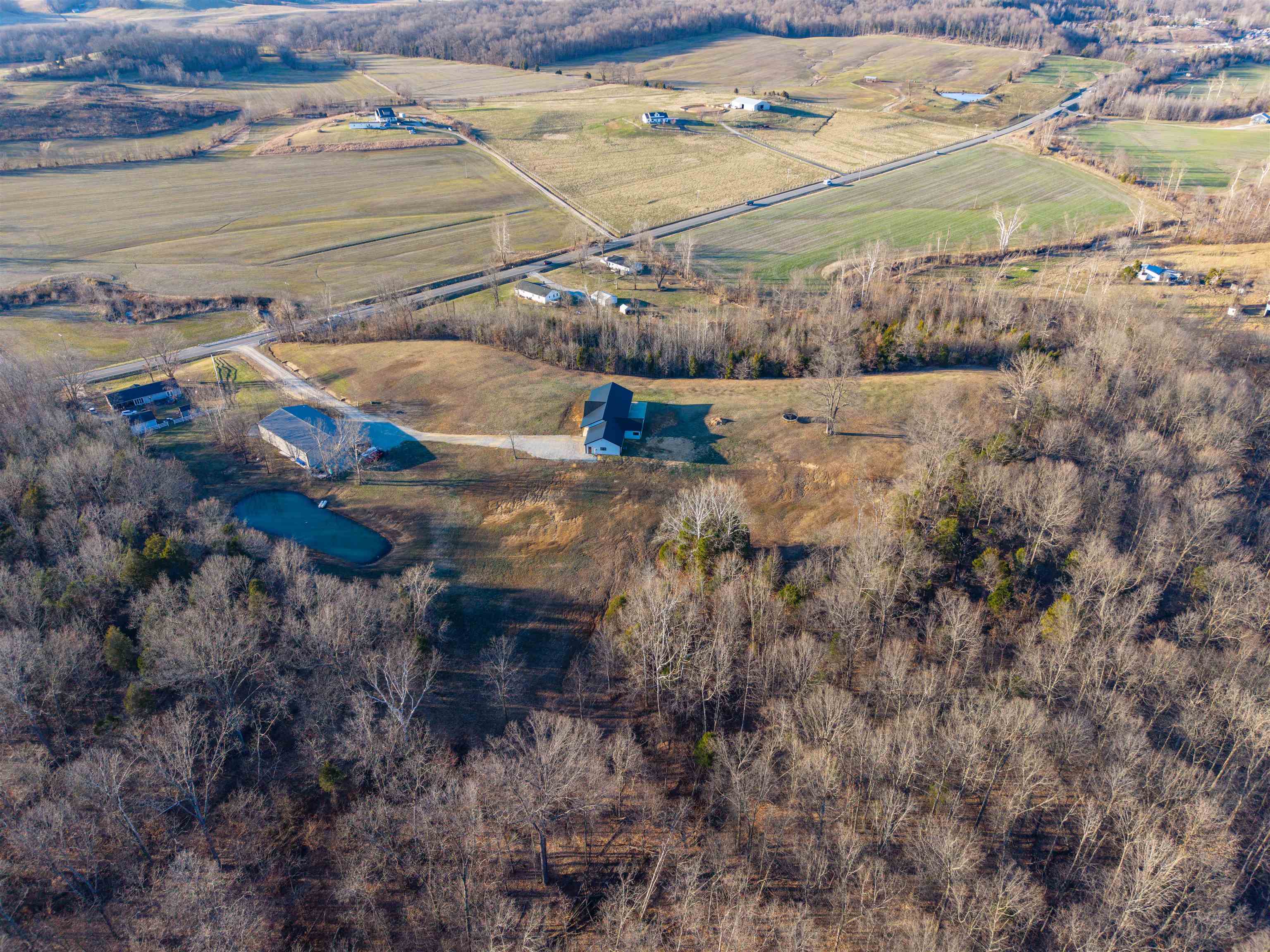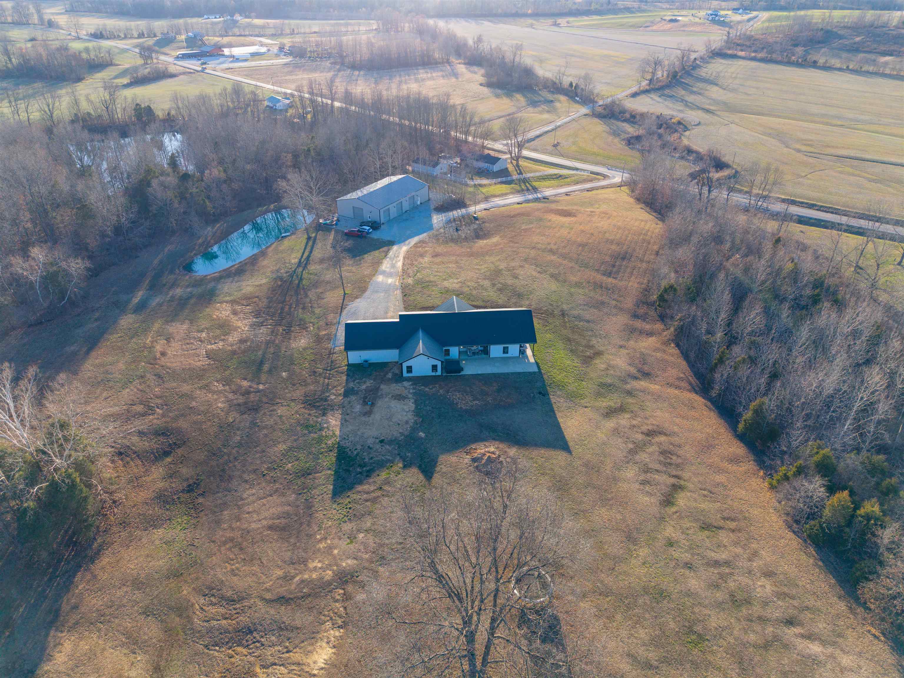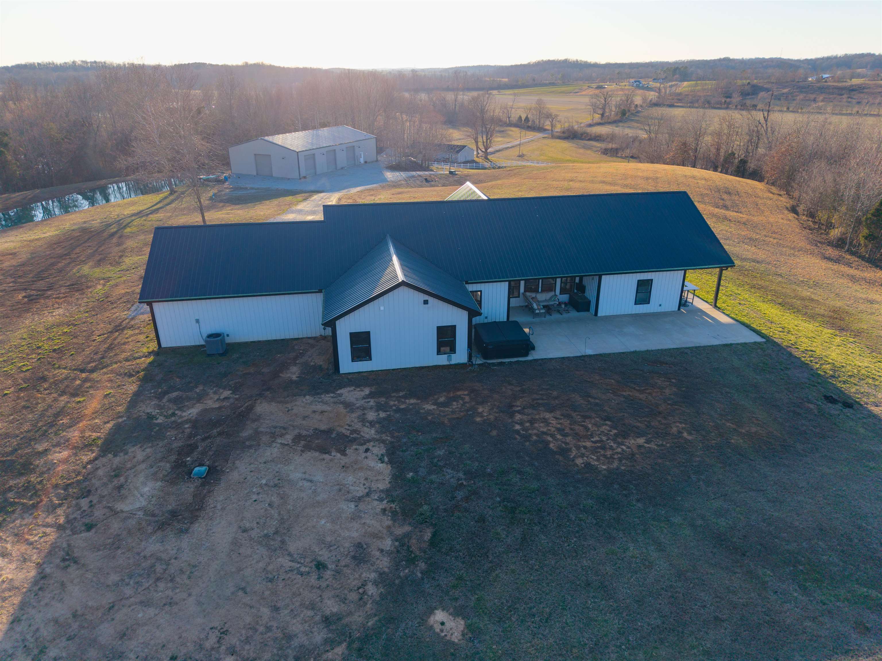Set on over 11 private acres in Hartford, this custom-built estate delivers a rare blend of architectural presence, refined finishes, and unmatched functionality. The primary residence spans over 2,200 square feet and offers 3 bedrooms and 2.5 bathrooms, thoughtfully designed with multiple living spaces that create both flow and flexibility. Two fireplaces anchor the interior with warmth and character, while soaring ceilings and expansive windows invite natural light throughout. The open concept layout is enhanced by quartz countertops, designer tile showers, and upscale finishes that reflect quality craftsmanship at every turn. A covered porch wrapping entirely around the home extends the living space outdoors, offering panoramic views of the surrounding acreage and a true estate style setting. Complementing the main residence is a well appointed secondary home featuring over 1,100 square feet with 3 bedrooms and 2 full bathrooms. Ideal for multi generational living, guests, executive retreat space, or income producing potential, this additional residence provides versatility rarely found in properties of this caliber. The shop spans nearly 2,800 square feet and stands as a defining feature of the estate. Substantial in scale and built for serious use, it offers exceptional space for business operations, recreation, equipment, or collector storage. It is not simply an outbuilding, but an asset. With more than 3,300 total square feet of living space between two residences, expansive acreage, a high capacity shop, and only three minutes from the parkway, this property represents a rare opportunity to own a true lifestyle estate in Hartford.